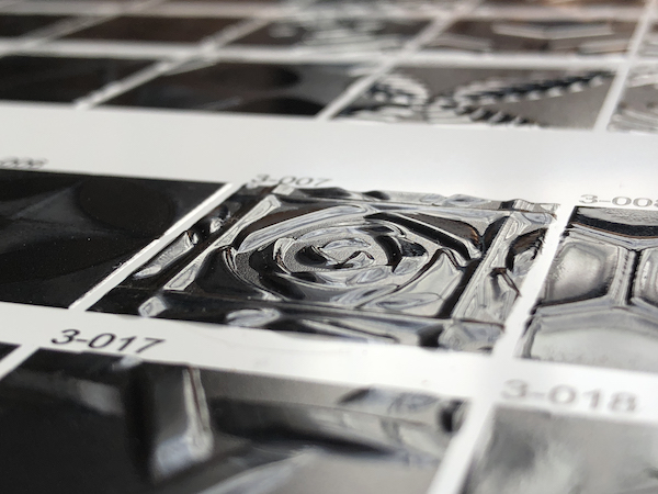 Embossed printing (thick layered print) with varnish ink on the UV printers can be set up simply by loading the Print Environment (pre-set) into VerteLith. Six different surface texture combinations are available with three varying thickness levels with a gloss finish and three varying thickness levels with a matte finish.